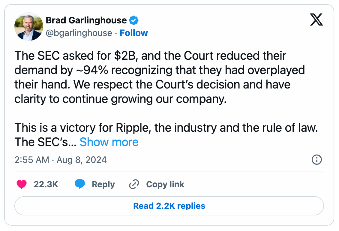 Ripple's CEO, Brad Garlinghouse, and Chief Legal Officer, Stuart Alderoty, regarded the reduced penalty as a victory, highlighting the 94% reduction from the SEC's initial proposal of up to $2 billion. This ruling brings Ripple's 4-year-long legal battle with the SEC closer to resolution. Following the announcement, the price of XRP rose by approximately 24%.