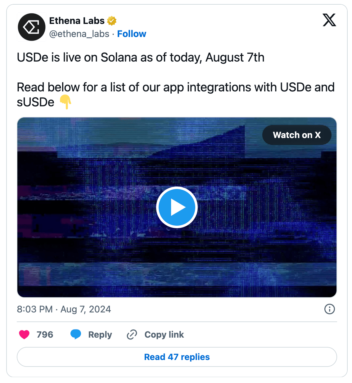 Ethena Labs has announced the integration of its USDe stablecoin with the Solana blockchain, allowing users to trade USDe on the Solana network. This move is expected to boost the adoption of USDe and its reward-accruing variant, sUSDe. Additionally, Ethena has added Solana's SOL as a backing asset, following a similar move with Bitcoin in April.