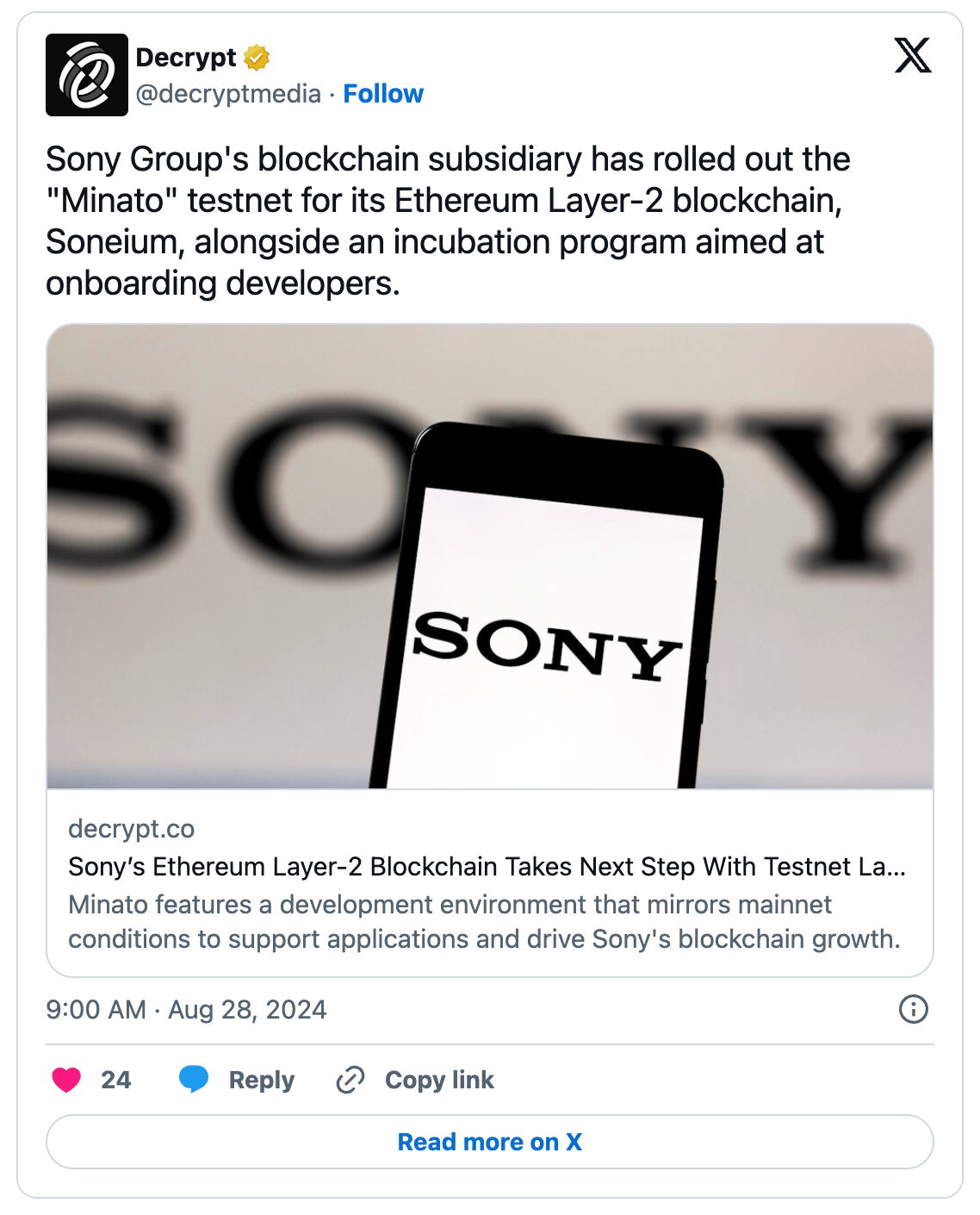 Sony's Soneium Layer 2 Launches Minato Testnet