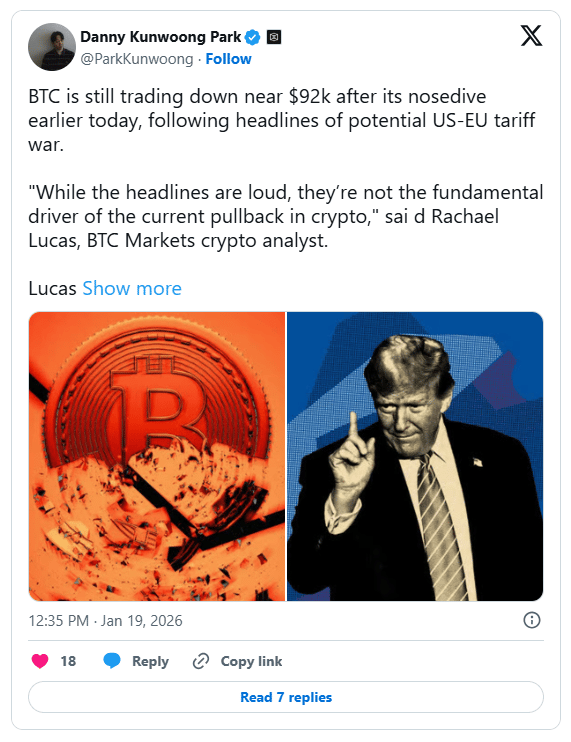 Analysts noted that the market was already fragile due to delays in the US crypto structure bill. European leaders characterized the tariff demands as blackmail and are currently preparing retaliatory measures against American service providers. Trading data shows that Bitcoin has now broken below its 50 week moving average, sparking automated selling across major global exchanges.
