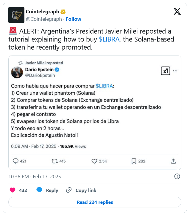 GM. As the LIBRA scandal deepens with new links to the failed MELANIA memecoin team, President Milei faces a lawsuit, while LIBRA surged 60% after he retweeted a how-to-buy guide.