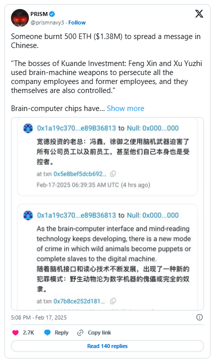 A mysterious Ethereum user has burned 500 ETH ($1.38 million) in a transaction containing an onchain message accusing Chinese hedge fund WizardQuant of "brain control." The message, claimed the firm's leadership had used "brain-machine weapons to persecute all company employees and former employees." This follows a pattern of prior burns, with 603.38 ETH ($1.67 million) already destroyed.