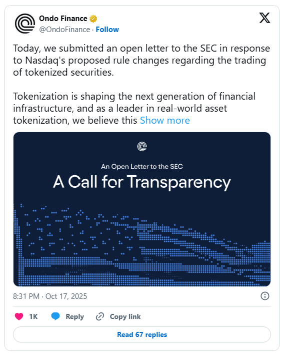 - Ondo Finance Asks the SEC to Delay Nasdaq's Tokenization
