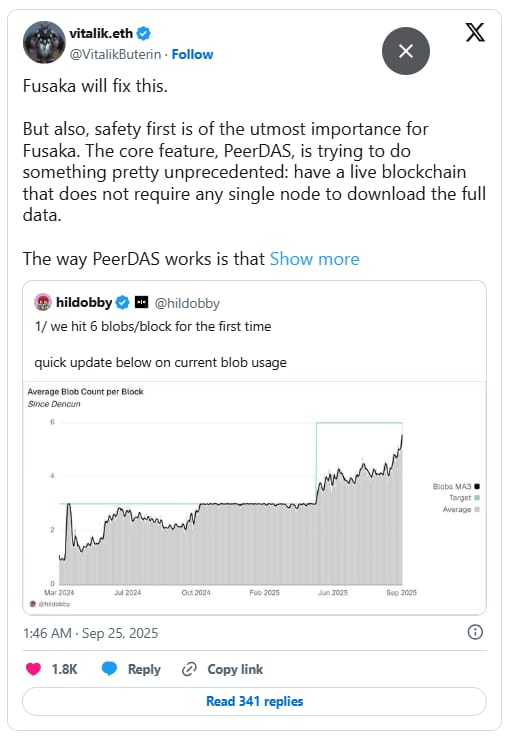 Ethereum recently reached six blobs per block, with rollups like Base and World consuming most available blobspace. Buterin said blob counts will increase cautiously, preventing strain on nodes as adoption grows. Longer term, he sees PeerDAS supporting both Layer 2 scaling and Layer 1 efficiency, expanding Ethereum’s throughput while preserving decentralization.