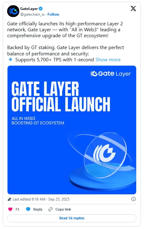 Crypto exchange Gate announced a new Layer 2 network, Gate Layer, built with Optimism’s OP Stack technology. The chain will use GateChain for settlement, GT as its gas token, and support high-speed, low-cost transactions. Executives said the network underpins Gate’s Web3 strategy, offering perpetuals trading and a no-code incubator for token launches.