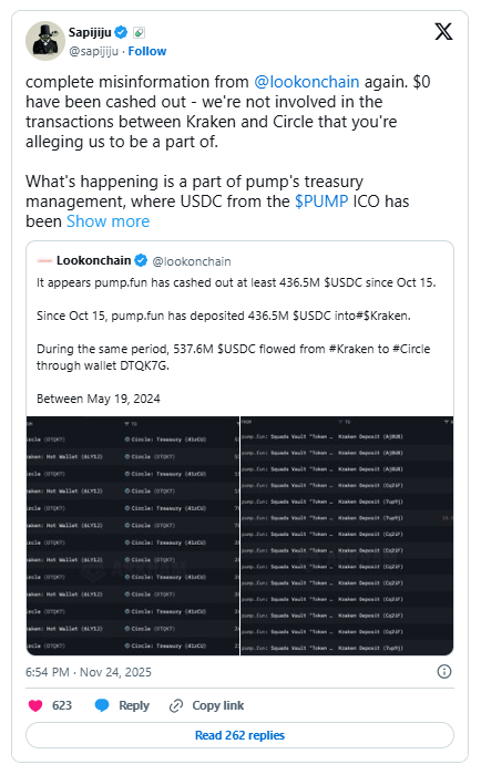 PumpFun co-founder Sapijiju denied claims that the project liquidated $436 million in USDC, calling reports misinformation. He said the funds were redistributed internally for treasury management following the PUMP ICO, not transferred for profit-taking. Sapijiju emphasized that the tokens remain within company control and support ongoing operational reinvestments, not offloading to exchanges.