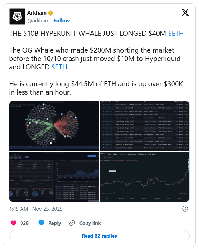 A trader nicknamed the “OG Whale,” known for profiting $200 million from October’s crash, has opened $44.5 million in ETH longs. Data from Arkham Intelligence showed the unidentified whale adding $10 million Monday, extending prior leveraged exposure on Hyperliquid. Analysts said the move indicates renewed conviction that Ethereum’s price has reached a potential cyclical bottom.