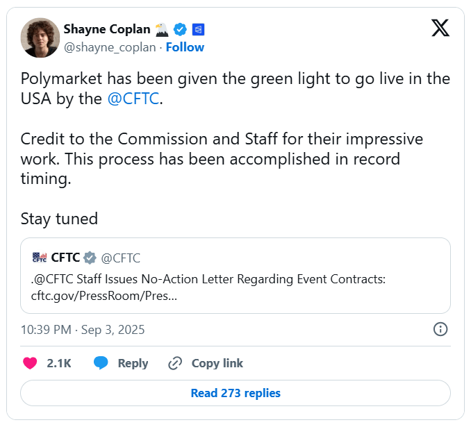 Polymarket CEO Shane Coplan confirmed the decision on X, calling the timeline “record speed” and crediting CFTC staff for expedited approval. The platform, which surged in popularity during the 2024 election cycle, now plans to expand US prediction market offerings.