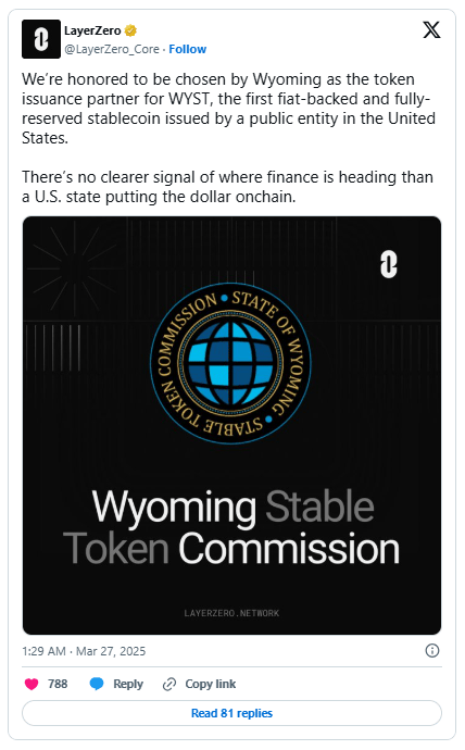 Wyoming state officials said Wednesday that they are preparing to launch the first state-issued fiat-backed stablecoin in the U.S. by July. Dubbed the Wyoming Stable Token (WYST), the digital dollar is being tested on Avalanche, Ethereum, Solana, and other networks with support from interoperability firm LayerZero.