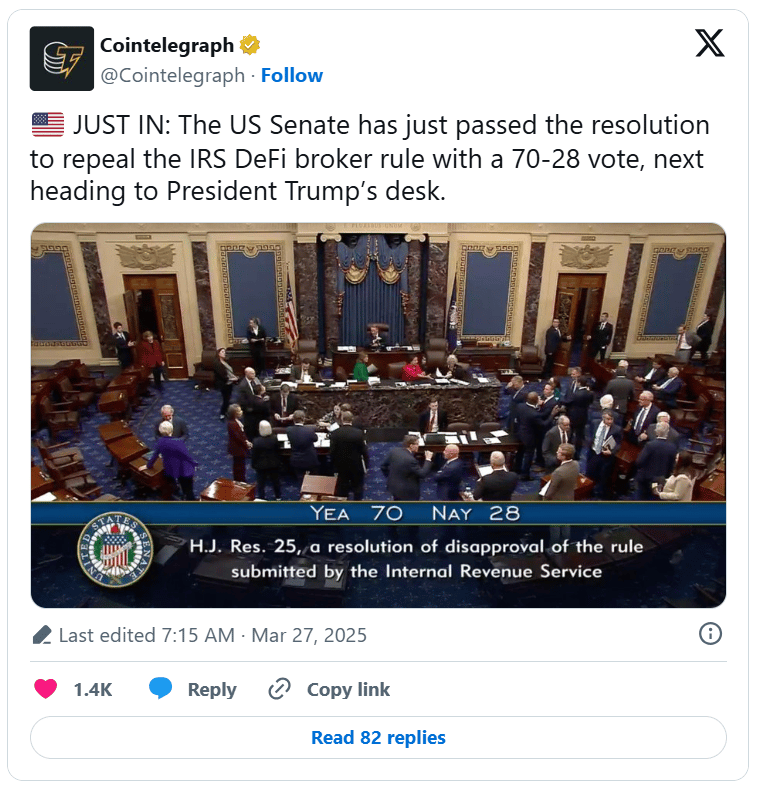 The U.S. Senate voted 70-28 late Wednesday to repeal a Biden-era IRS rule requiring decentralized finance platforms to report user trading activity. President Donald Trump is expected to sign the resolution, with White House crypto czar David Sacks confirming the administration's support.