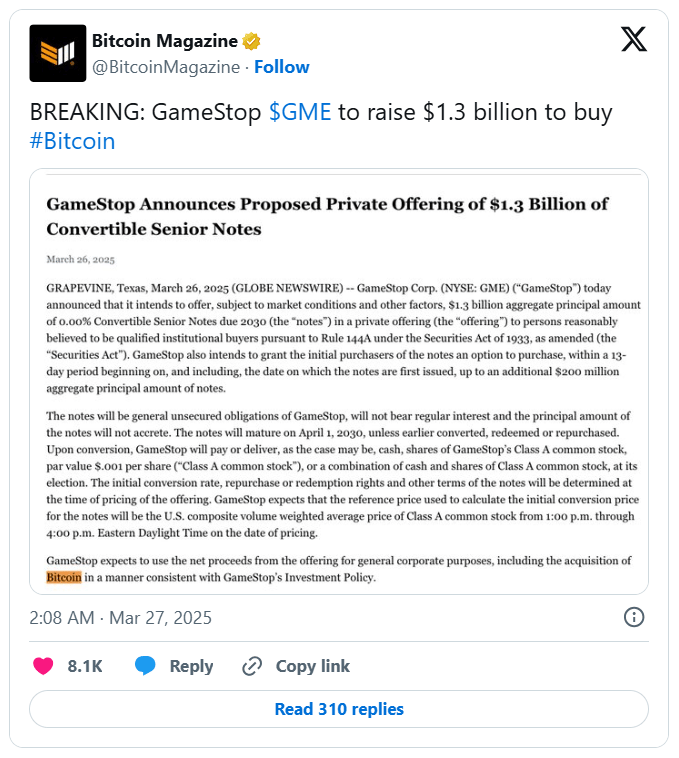 GameStop announced Wednesday it will raise up to $1.3 billion through convertible senior notes to fund future Bitcoin purchases. The Texas-based gaming retailer said the proceeds will be used for general corporate purposes, including acquiring BTC as a treasury asset. The debt instrument will offer a 0% dividend and can be converted into Class A shares at a future date determined by the company.