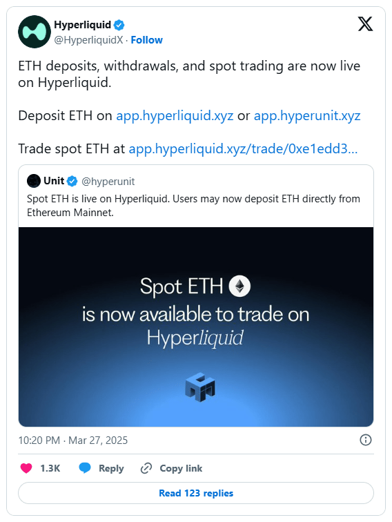 Hyperliquid just enabled direct ETH spot trading via deposits and withdrawals, expanding beyond its origins in perpetual futures. The rollout follows this week’s integration of its proprietary Layer 1 HyperCore with the EVM-compatible HyperEVM environment. Users can now move ETH seamlessly across the Hyperliquid platform and its Hyperunit token layer, which also supports BTC and SOL.