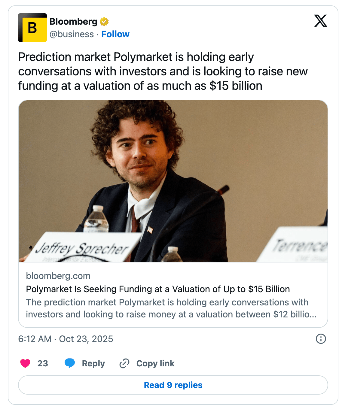 Polymarket is reportedly seeking funding at valuations between $12 billion and $15 billion, according to Bloomberg sources. Founded in 2020, the platform enables users to trade yes-or-no outcome markets on politics, sports, and global events. Rival firm Kalshi is similarly fielding investor proposals valuing it as high as $12 billion, reflecting surging interest in prediction markets.