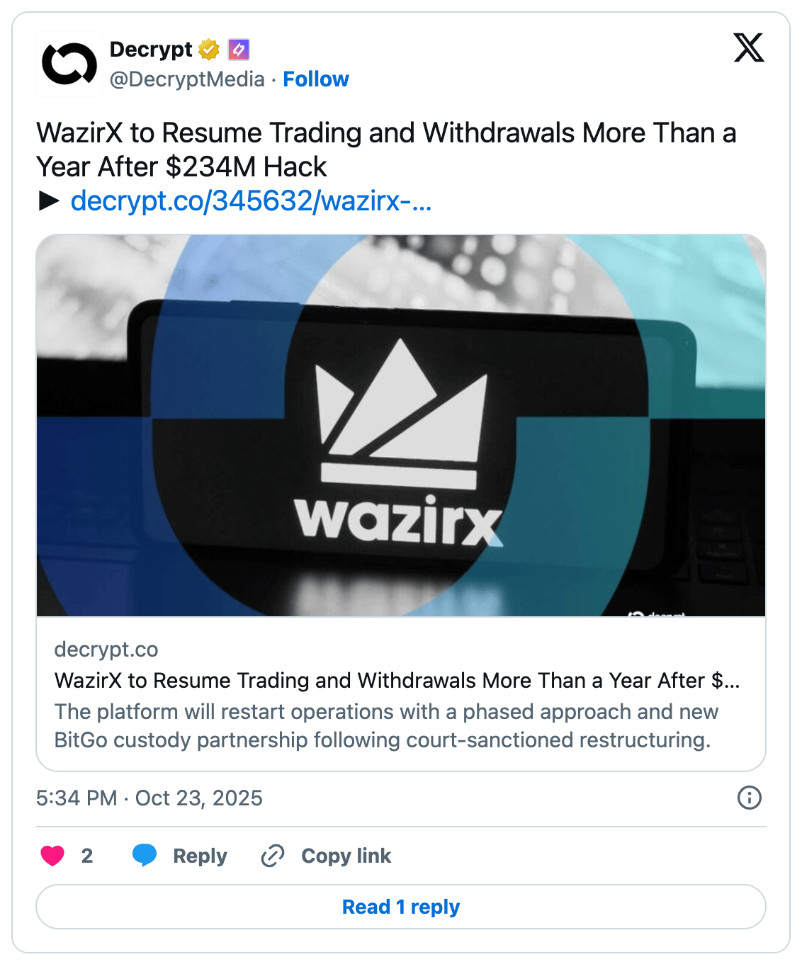 Indian crypto exchange WazirX will resume trading on October 24 following a year-long suspension after a massive hack. Backed by 95.7% of creditors, its Singapore-approved restructuring plan allows six million users to regain access to accounts. Trading will restart gradually with 25% of assets re-enabled daily, culminating in full operations by Monday.