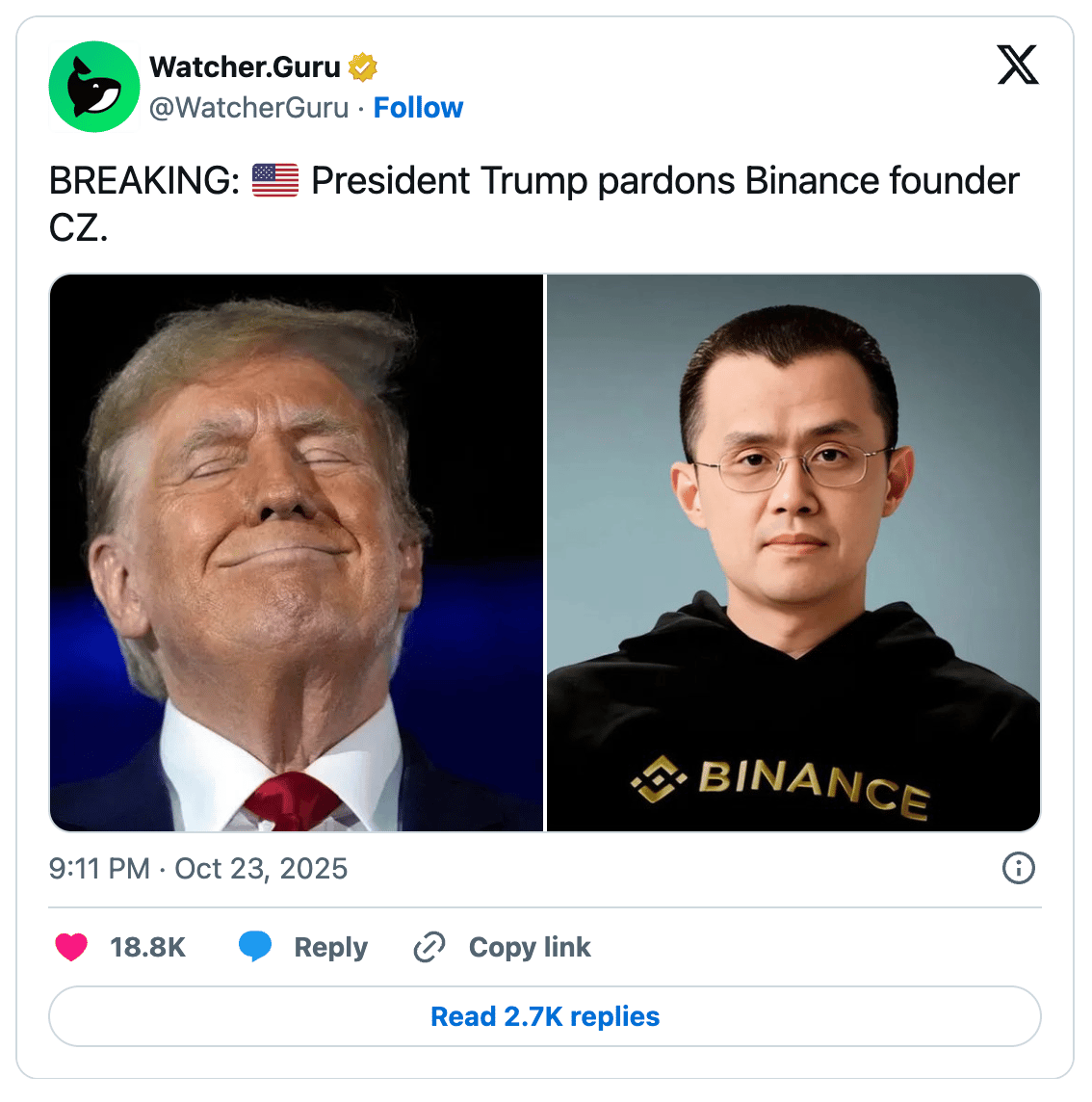 - President Trump Pardons Binance Founder Changpeng Zhao