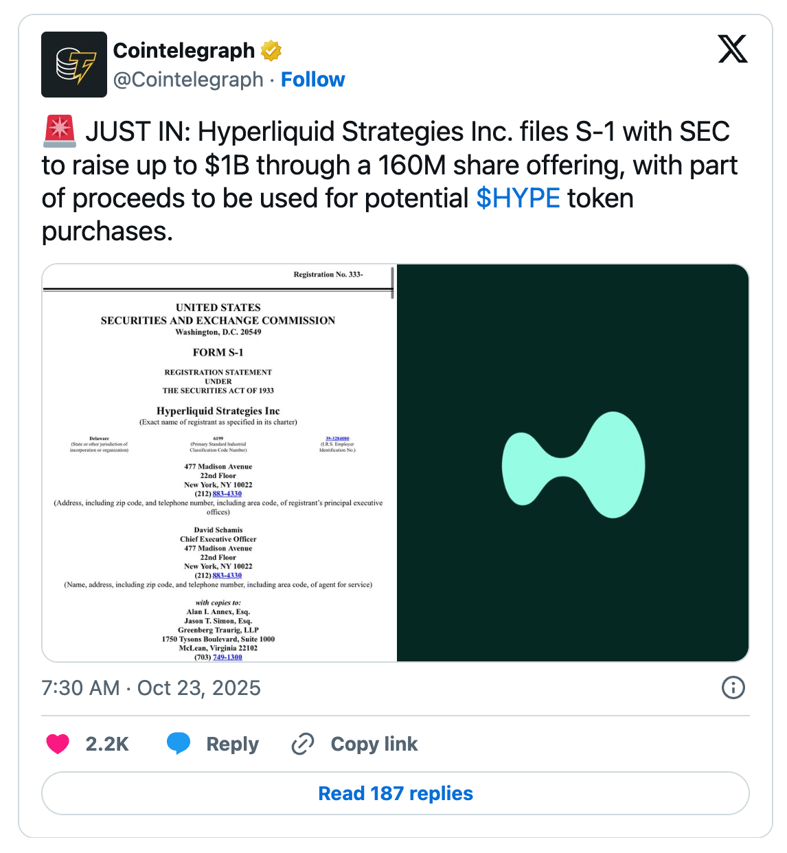 Hyperliquid Strategies filed an S-1 statement with the US Securities and Exchange Commission seeking to raise $1 billion. The offering, comprising 160 million shares, will fund expansion of its HYPE token treasury and broader corporate initiatives. The entity emerged from a merger between Sonnet BioTherapeutics and Rorschach I, aiming to launch publicly later this year.