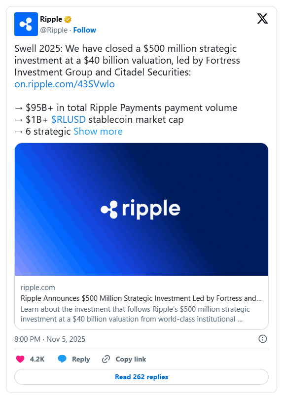 Ripple has secured a $500 million equity investment from affiliates of Citadel Securities, Fortress Investment Group, and Brevan Howard. The raise values the crypto fintech firm at $40 billion, underscoring renewed institutional confidence following XRP’s historic rally this year.