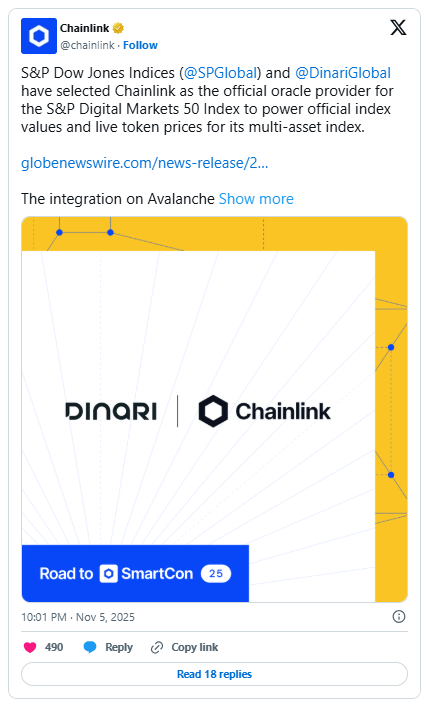 Chainlink and Dinari announced plans to bring the S&P Digital Markets 50 Index onchain before year-end. The benchmark, developed with S&P Dow Jones Indices, tracks thirty-five public companies and fifteen major digital assets. Chainlink oracles will deliver authenticated pricing data, ensuring real-time accuracy and transparency across decentralized finance and traditional markets.