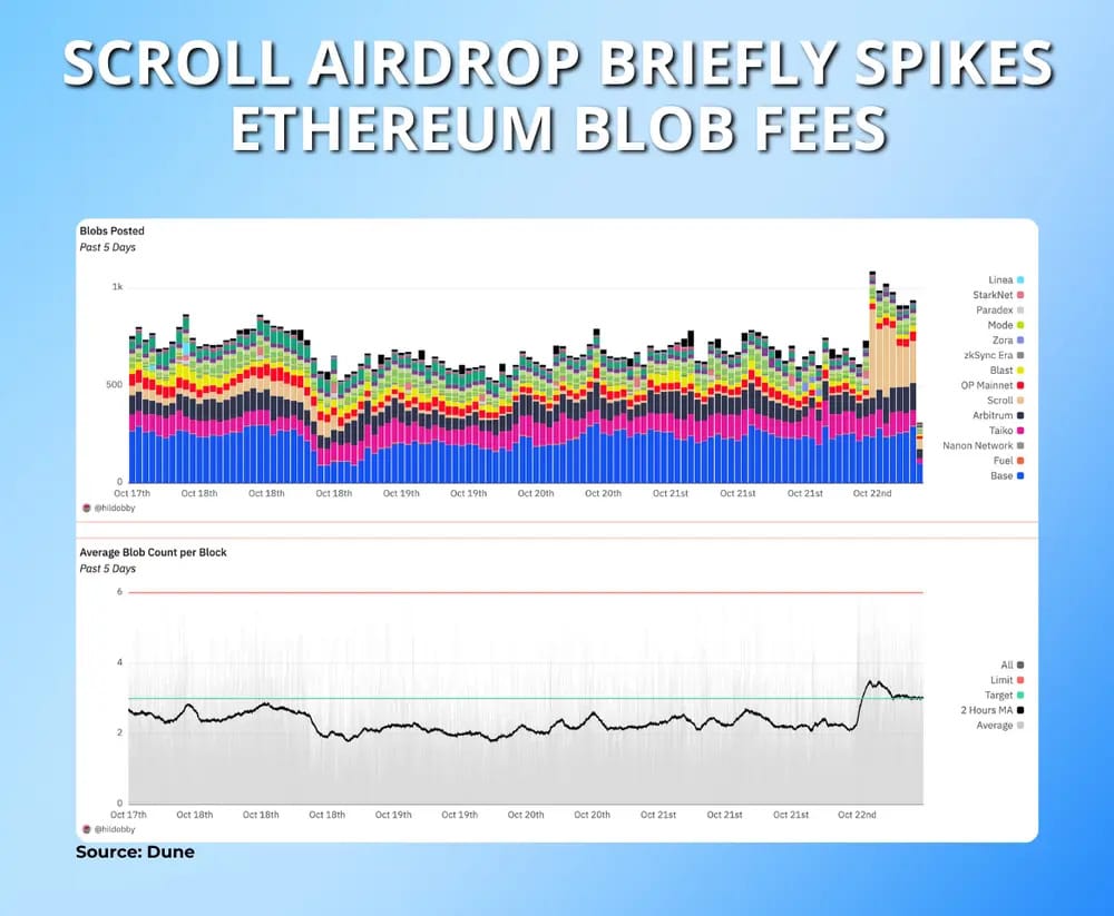 Scroll's airdrop caused blob fees to surge as high as $4.52, the third instance of such spikes since Ethereum’s Dencun upgrade. Pseudonymous crypto analyst Hildobby blamed the airdrop for triggering the blob market, which had been free up until the sudden demand spike on Oct. 22.