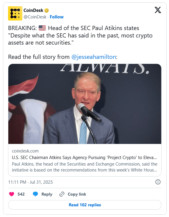 GM. SEC Chair Paul Atkins just greenlit ICOs and airdrops under a sweeping new initiative called Project Crypto, marking a dramatic shift toward open token launches and DeFi-friendly regulation.