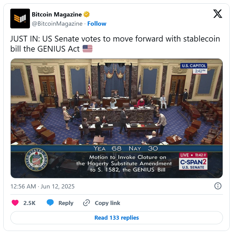 GM. The Senate just advanced the GENIUS Act, a landmark stablecoin bill backed by Trump that cleared a 68-30 vote and could create the first federal rules for dollar-backed tokens.
