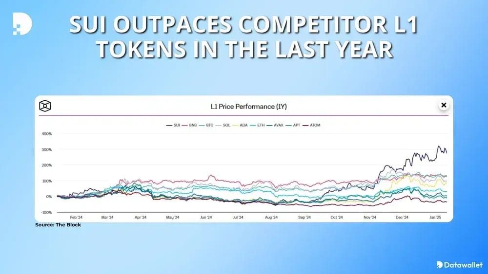Layer 1 blockchain Sui achieved a 542% price increase in 2024, surpassing its competitors Bitcoin, BNB, Solana, Cardano, Ethereum, and others. The network processed 7.5 billion transactions and peaked at $2 billion in Total Value Locked, signaling investor interest in newer L1 networks.