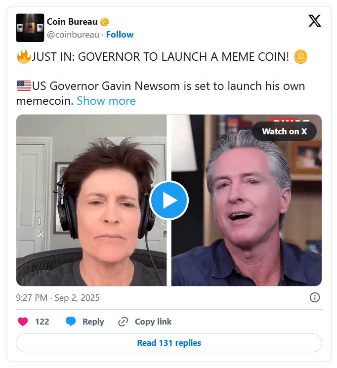 California Governor Gavin Newsom said he intends to launch a meme coin mocking President Donald Trump’s ventures. Speaking on a podcast, he joked about creating “Trump Corruption Coin” to rival the president’s Solana-based TRUMP token. Newsom argued the project would highlight conflicts of interest and lampoon Trump’s broader embrace of cryptocurrency initiatives.
