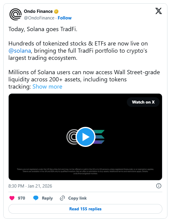 Ondo Finance expanded its tokenized equities platform to the Solana blockchain this Wednesday morning. The move introduces over 200 digital versions of US stocks and ETFs to the network for global investors. By leveraging Solana's high speed infrastructure, the firm aims to improve liquidity depth for real world assets that were previously limited to Ethereum.