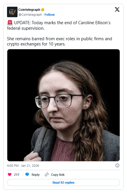 Former Alameda Research executive Caroline Ellison is scheduled for release from federal custody this Wednesday. She has been serving a 2 year sentence in a New York halfway house following her cooperation in the FTX fraud trial. The Federal Bureau of Prisons confirmed her transition out of community confinement after she provided critical testimony against Sam Bankman-Fried.