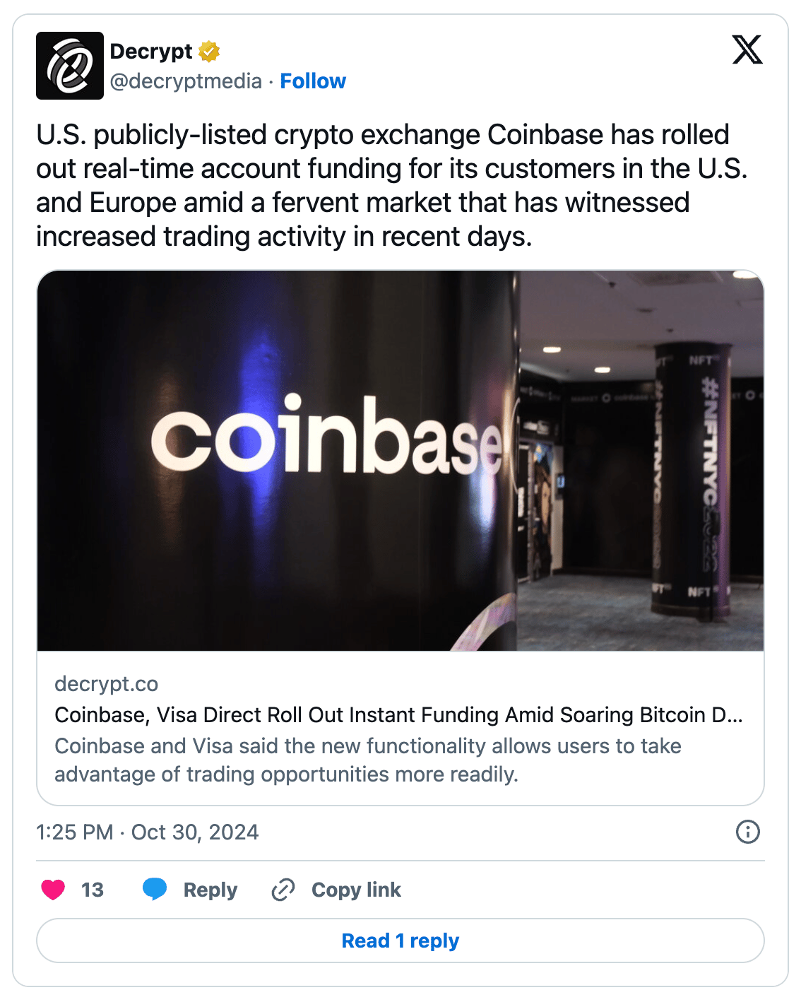 Users can now also purchase crypto directly with their Visa debit cards and withdraw funds to bank accounts without delay. The new funding option complements Coinbase’s Visa debit card, which allows users to spend crypto at retailers or convert it to cash. Coinbase expects this to improve user experience amid the recent removal of its Paycheck Direct Deposit service.