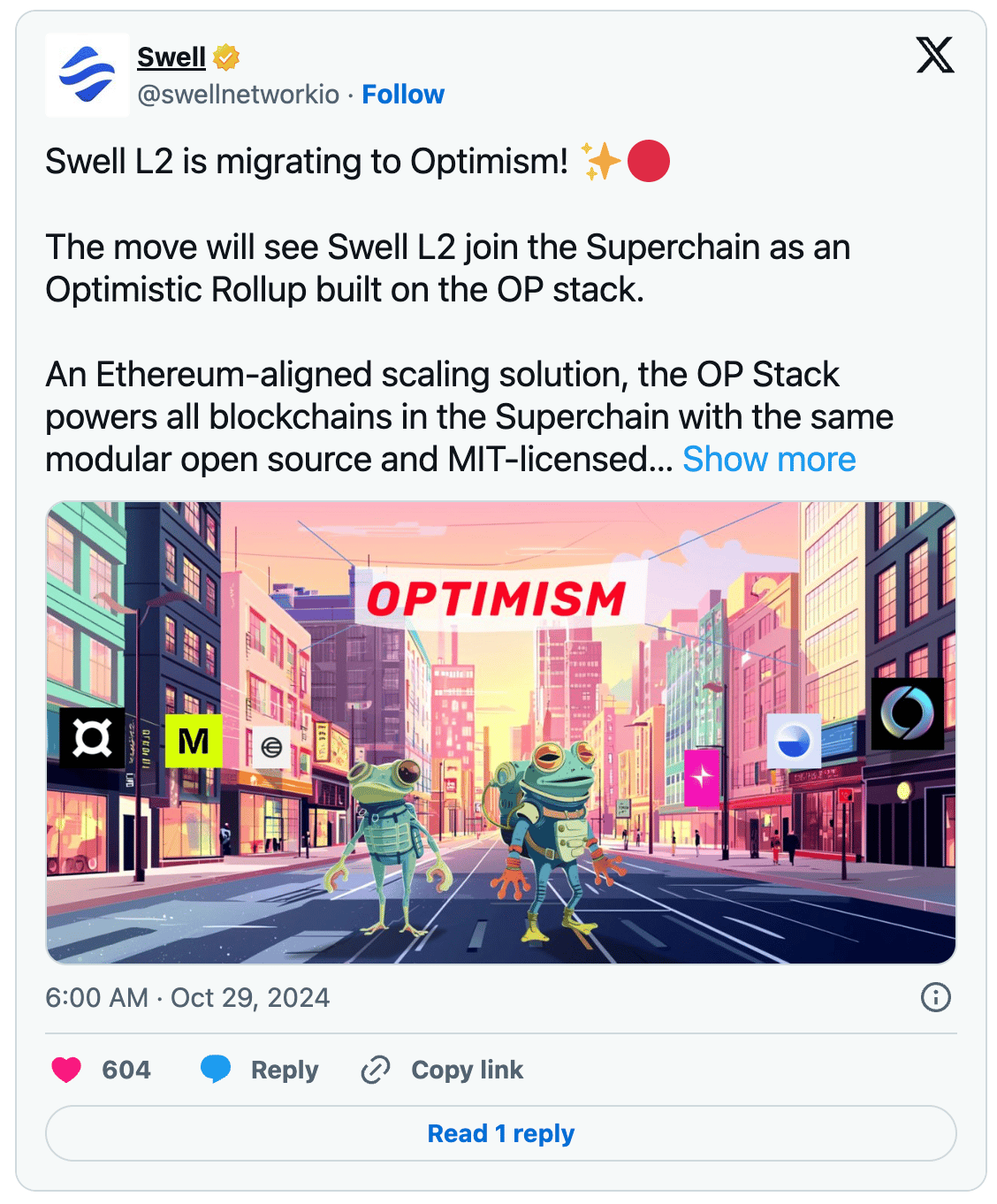 Swell, a liquid restaking protocol, is developing a Layer 2 rollup on the Optimism Superchain, using ETH as the gas token. Swell’s new rollup will use a "proof of restake" model for security within the Superchain and allocate sequencer revenue to the Optimism Collective. Previously planning to use Polygon’s chain kit, Swell chose OP Labs instead, joining Superchain players like Base and Kraken’s Ink.
