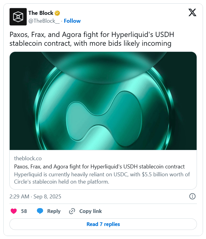Hyperliquid announced that stablecoin issuers Paxos, Frax Finance, Agora, and Native Markets submitted bids to issue its planned USDH token. The decentralized exchange, which holds $5.5 billion in USDC deposits, will decide the winner through a validator vote scheduled for September 14.