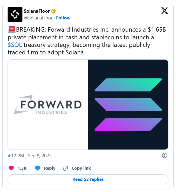 Forward Industries secured $1.65 billion in cash and stablecoin commitments to build a Solana-focused institutional treasury. The PIPE funding round was led by Galaxy Digital, Jump Crypto, and Multicoin Capital, with Cantor Fitzgerald advising. Company shares surged 128% in pre-market trading, while Solana’s price rose modestly after the announcement.