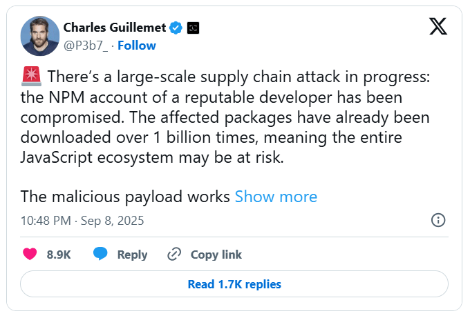 Hackers have compromised core JavaScript libraries in what experts are calling the largest supply chain attack to date. Popular packages like chalk and strip-ansi were secretly infected with malware, exposing billions of weekly downloads to risk. The malicious code targets crypto transactions, secretly replacing wallet addresses to divert funds to attackers’ controlled wallets.