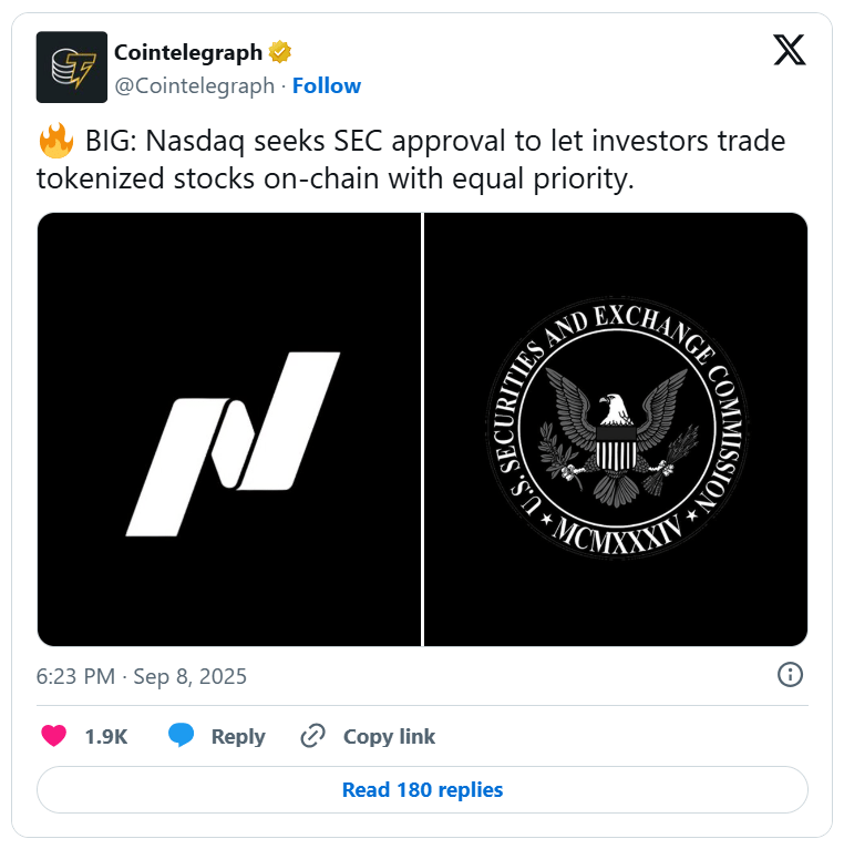 In other news, Nasdaq seeks SEC approval to record stocks in tokenized form, Forward Industries raises $1.65 billion for a Solana treasury, and German police may have overlooked $5 billion in BTC.
