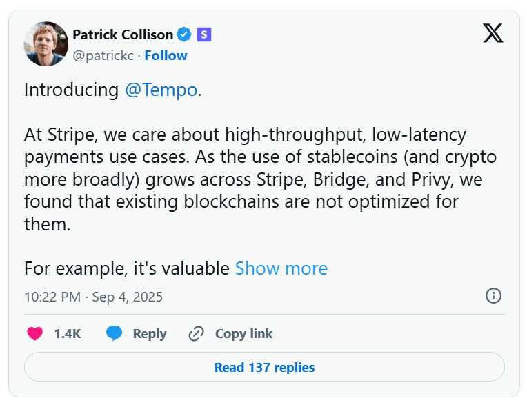 Stripe and Paradigm presented a payments-focused blockchain called Tempo, now in private testnet with major corporate partners. Stripe CEO Patrick Collison described Tempo as a payments-oriented layer-1 optimized for high-scale, real-world financial services applications across global markets.