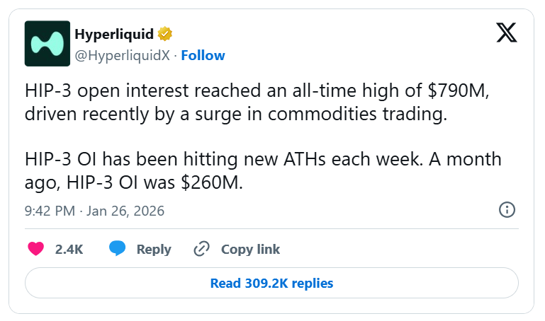 Hyperliquid reached a record $793 million in open interest this Monday following a surge in commodity trading. The platform’s HIP-3 framework allows builders to launch permissionless perpetual contracts for any asset with a reliable price feed. This milestone comes as on-chain derivatives volume on the network surpassed $25 billion since its mid-October debut.