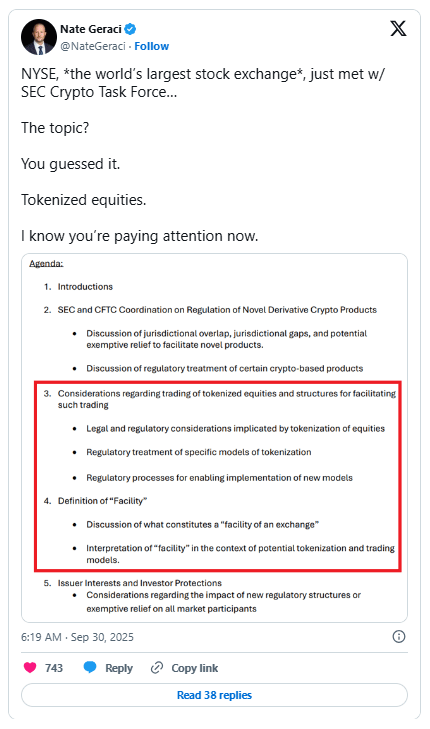 GM. The SEC is drafting rules to allow tokenized stocks on crypto exchanges, with Nasdaq, Coinbase, Robinhood, and Kraken preparing applications as institutional appetite accelerates.