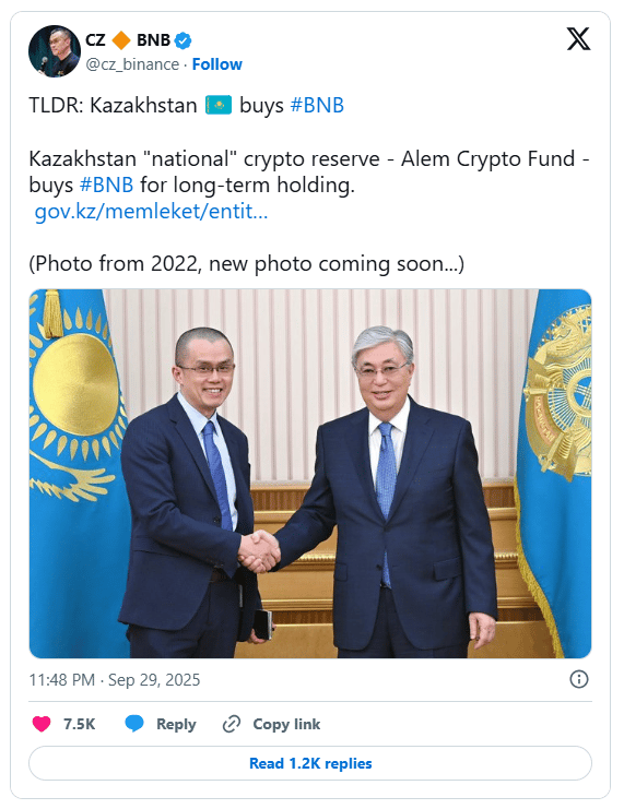 Kazakhstan announced a state-backed crypto reserve fund, Alem Crypto Fund, seeded with BNB purchased via Binance Kazakhstan. Managed by Qazaqstan Venture Group under the Astana International Financial Centre, the fund will build long-term digital asset reserves. Officials said its mandate is to strengthen national strategy by diversifying holdings into blockchain-based instruments.