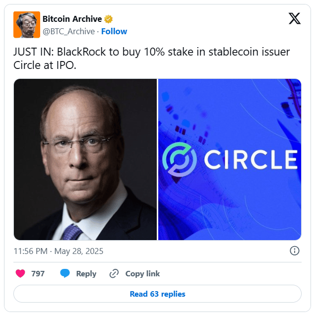 Circle co-founder Jeremy Allaire will sell 8% of his stake, while other executives and VCs plan to offload similar amounts. BlackRock has backed Circle since 2022 and manages part of USDC’s reserves via the Circle Reserve Fund. Circle’s valuation target is $5.43 billion, but it enters a volatile market shaped by Trump-era economic policy changes.