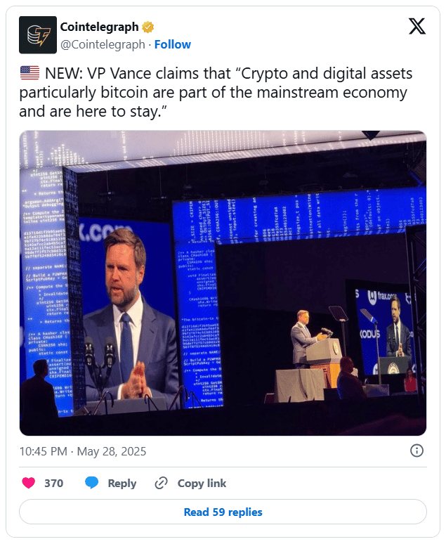 Speaking at the Bitcoin 2025 conference in Las Vegas, Vice President J.D. Vance said a clear regulatory framework is vital to prevent crypto innovation from leaving the USA. He endorsed a market structure bill and warned that failing to pass it would drive the $3 trillion industry abroad. Vance said Trump’s administration is committed to keeping crypto "mainstream and American-led."