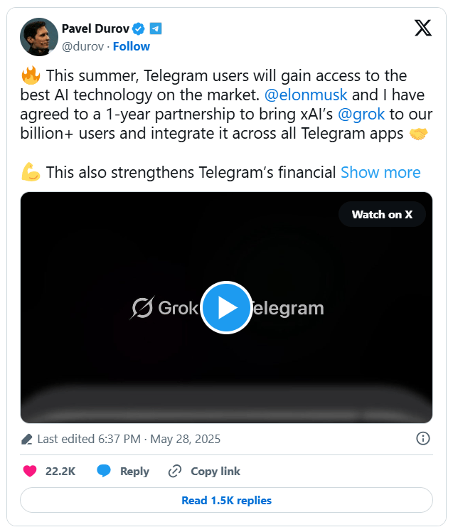 Founder Pavel Durov announced Telegram will integrate xAI’s chatbot Grok and take a 50% cut of all subscription sales through the app. “This investment partnership will allow us to further monetize Telegram without compromising user experience,” he said in a post.