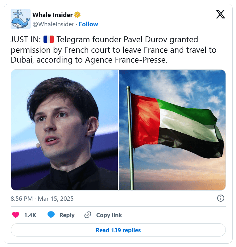 Toncoin (TON) surged 20% after Telegram founder Pavel Durov was granted permission to temporarily leave France for Dubai, sources told AFP. Durov had been banned from leaving since his August 2024 arrest, when he was charged with failing to curb extremist and criminal content on Telegram.