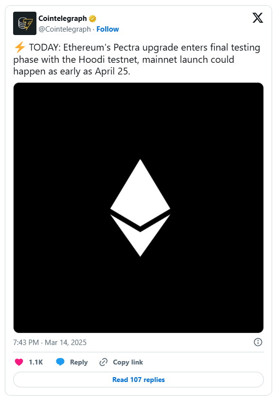Ethereum developers have announced the launch of a new testnet, Hoodi, to finalize testing for the Pectra upgrade after previous failures on Sepolia and Holesky. The testnet will go live on March 17, with Pectra scheduled for testing on March 26 to evaluate performance and stability. Developers hope this will clear the way for a mainnet upgrade by late April or early May.