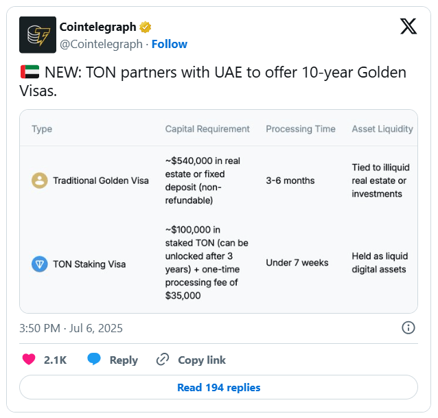 The TON Foundation, a blockchain project tied to Telegram, launched a program granting 10-year UAE Golden Visas to those who stake $100,000 in Toncoin and pay a $35,000 fee. Announced Saturday, the offer bypasses traditional routes like real estate or job sponsorships, which typically cost over $500,000.