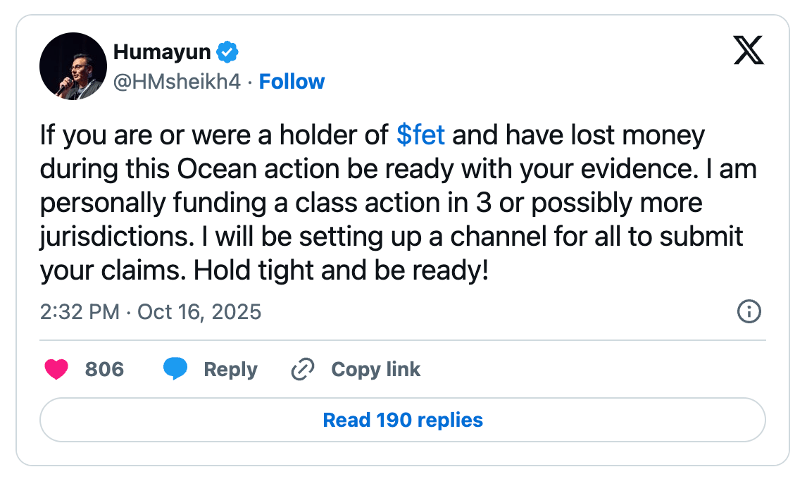 A conflict between FetchAI founder Humayun Sheikh and Ocean Protocol escalated into legal threats over alleged unauthorized token transfers. Sheikh accused Ocean of minting and converting tokens prior to the Artificial Superintelligence Alliance merger, claiming improper disclosure and fund movement. The disputed 286 million FET tokens, valued at near $84 million, have drawn widespread onchain attention.