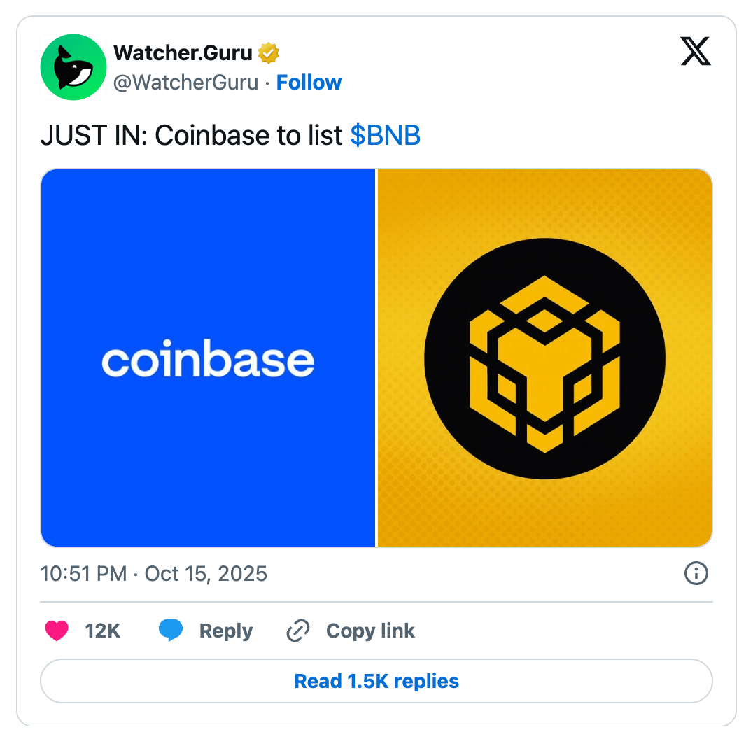 Coinbase announced plans to list BNB, signaling its first support for a token tied to rival exchange Binance. The asset appeared on Coinbase’s listing roadmap following industry debate over listing fairness and transparency and costs in token listings. Executives said the process will open once market infrastructure and liquidity safeguards are established.