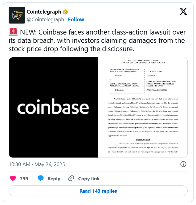 Coinbase is facing a new class action lawsuit filed by shareholders after its stock dropped 7.2% following a delayed data breach disclosure. Filed in Pennsylvania on May 23, the complaint alleges Coinbase failed to inform investors about a December breach involving bribed employees. It also claims the exchange violated U.K. compliance terms through its CB Payments division.