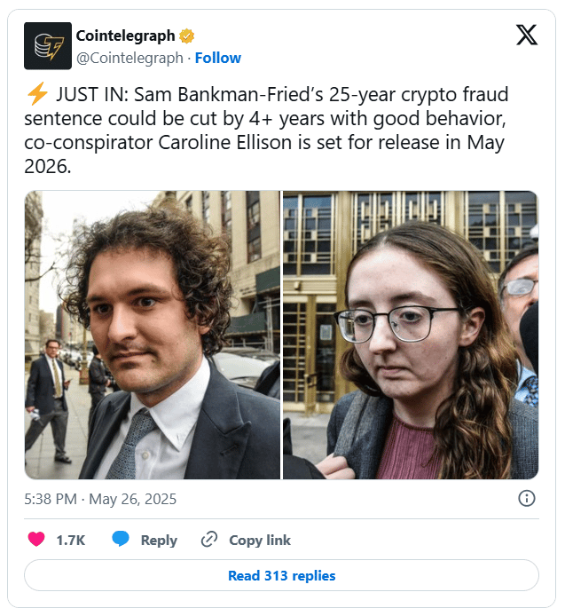 SBF was sentenced in March 2024 to 25 years for misappropriating FTX customer funds to support political donations and prop up Alameda Research. While in prison, he reportedly shared a unit with Sean “Diddy” Combs and gave a surprise interview to Tucker Carlson. Caroline Ellison, another central figure in the case, is now projected to be released in May 2026 after a two-year sentence reduction.