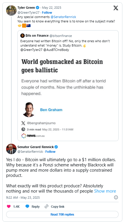 Australian Senator Gerard Rennick sparked backlash on May 23 after calling Bitcoin a “Ponzi scheme” and questioning its utility because “you can’t eat Bitcoin.” In a post on X, Rennick claimed Bitcoin would hit $1 million due to market manipulation by firms like BlackRock. He further argued that Australia needs “real engineers, not financial engineers.”